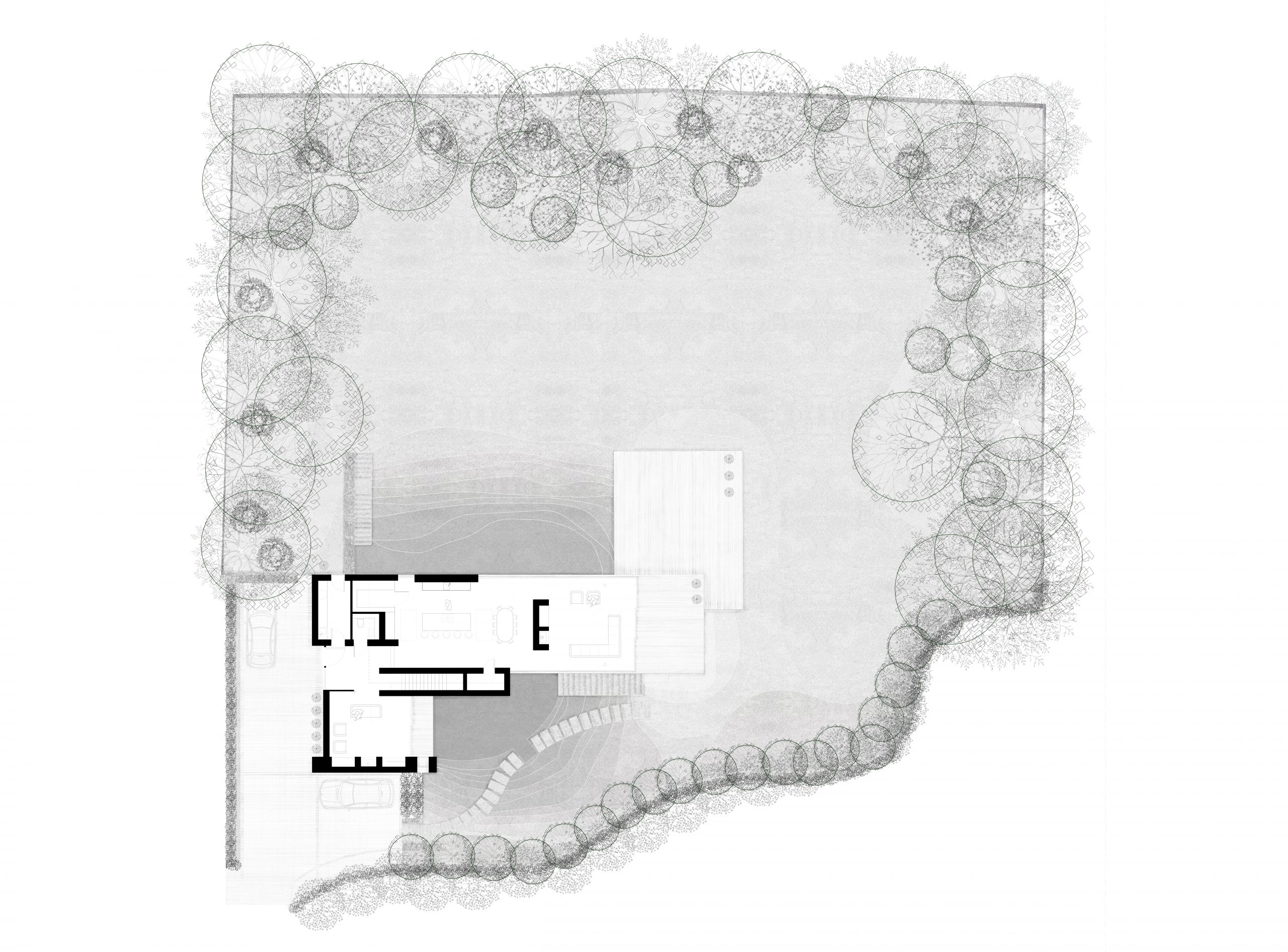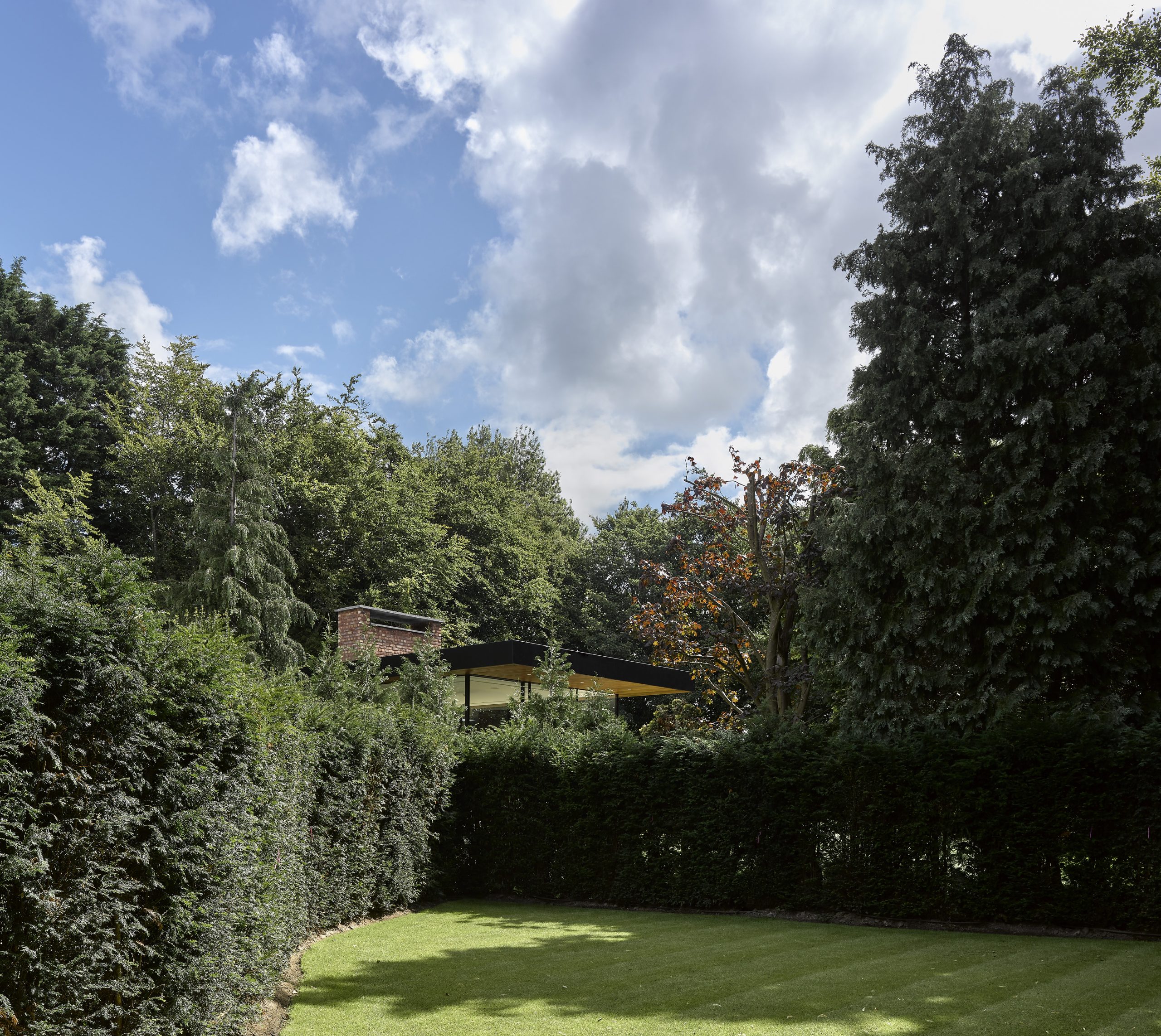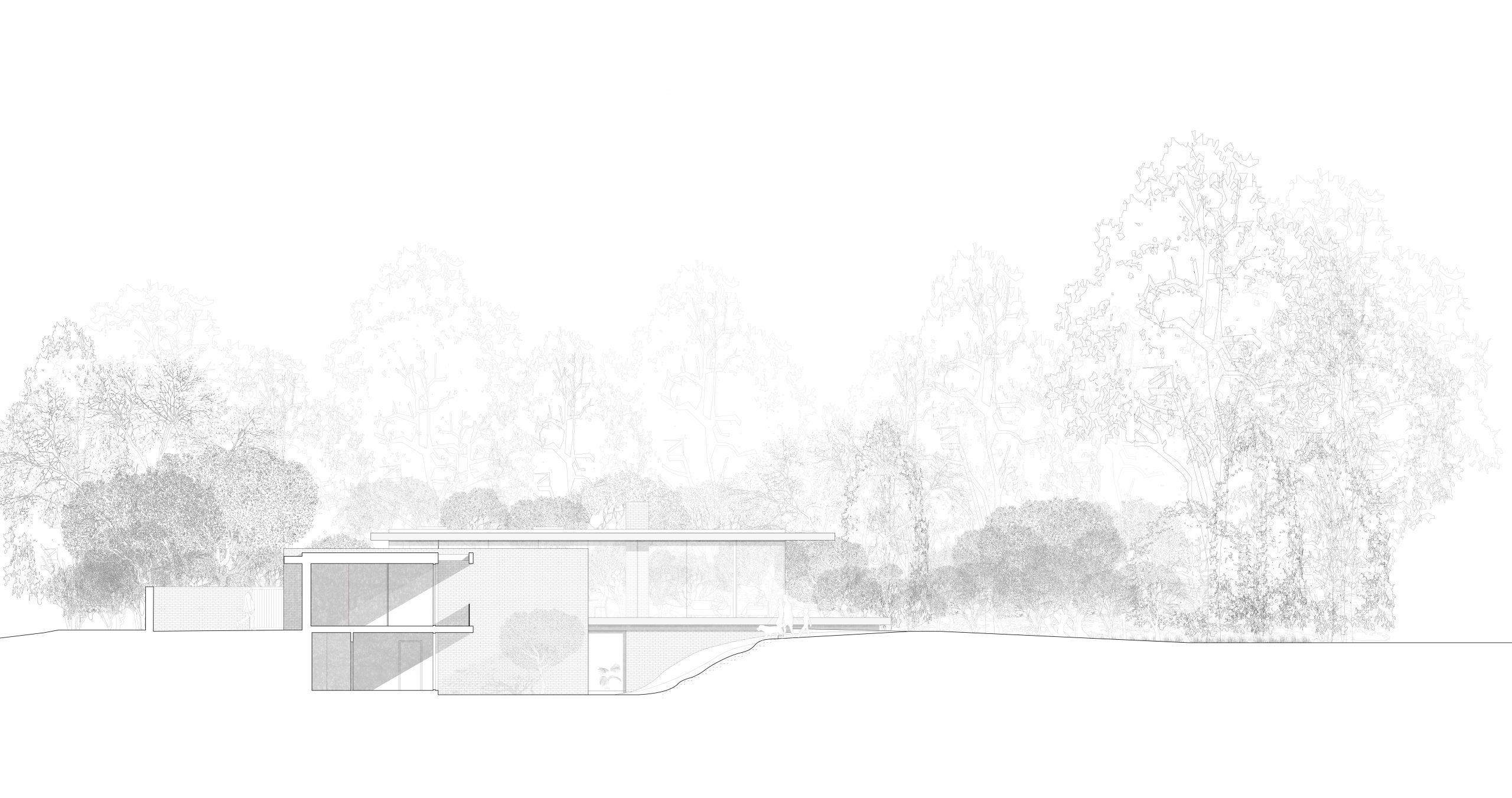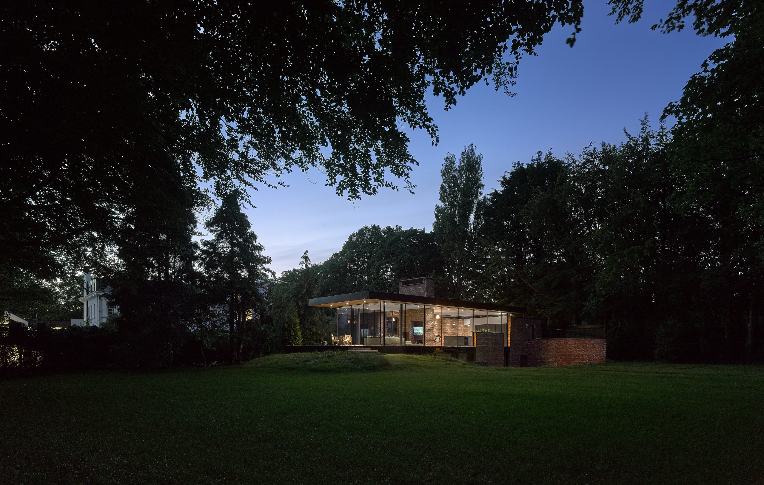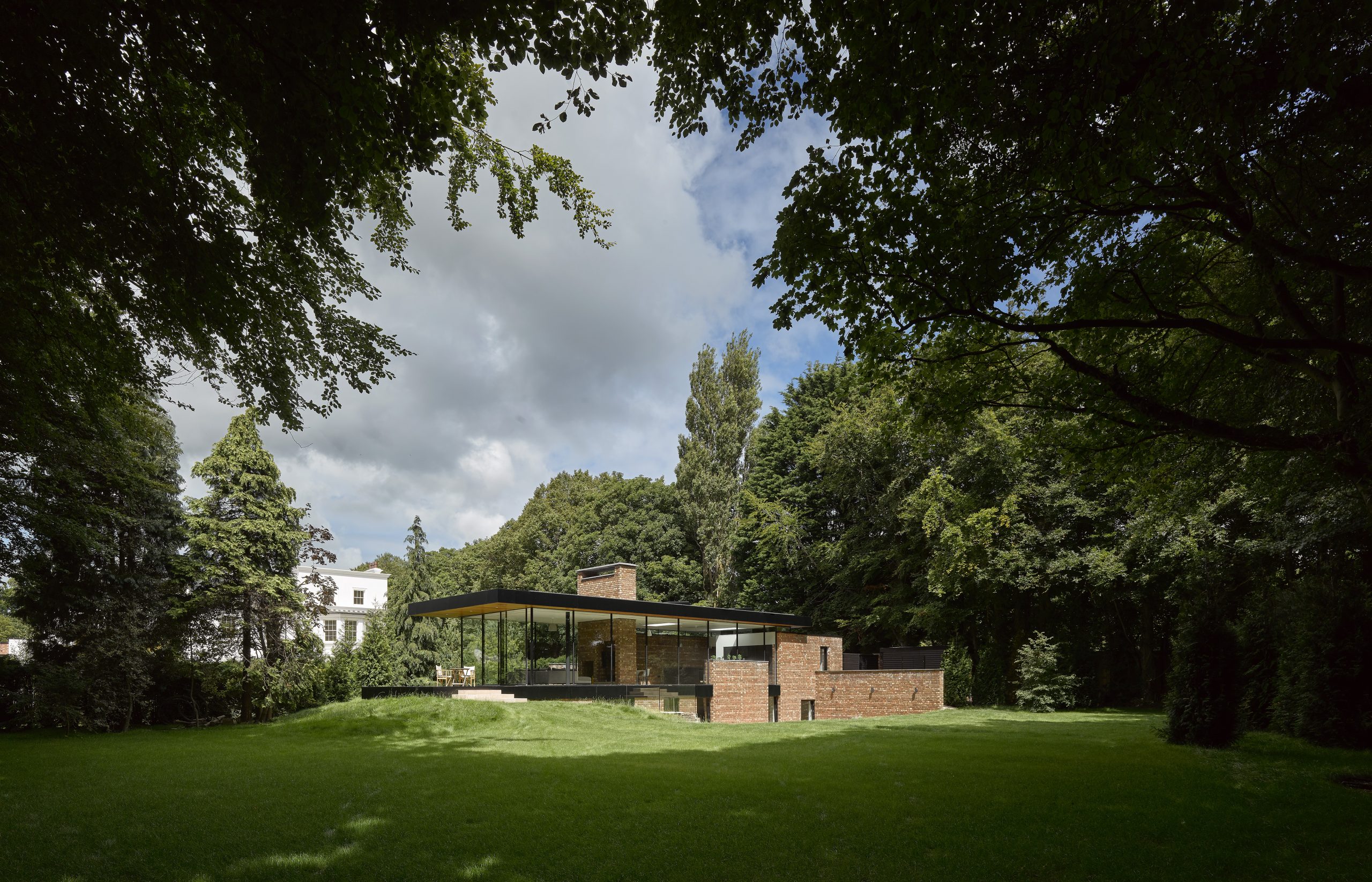 A modern pavilion-like house in a mature landscaped setting. This new single house, set within the grounds of a Listed Building and in a conservation area, takes its cues from the modern movement. Large expanses of frameless floor to ceiling glazing in the living spaces look out over a spectacular landscaped setting. Bedroom spaces face on to sunken courtyard gardens.