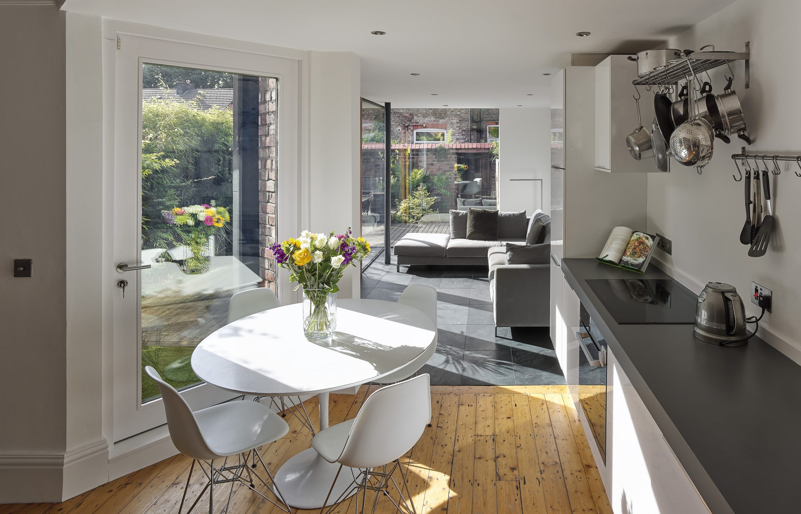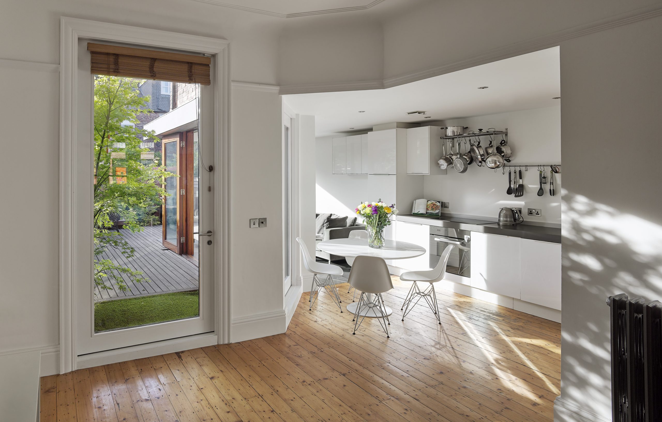 An Edwardian terraced house sensitively remodeled. A contemporary glazed rear extension and flowing open plan family living spaces combine seamlessly with the period details and charm of the original house to create a house of character and warmth.