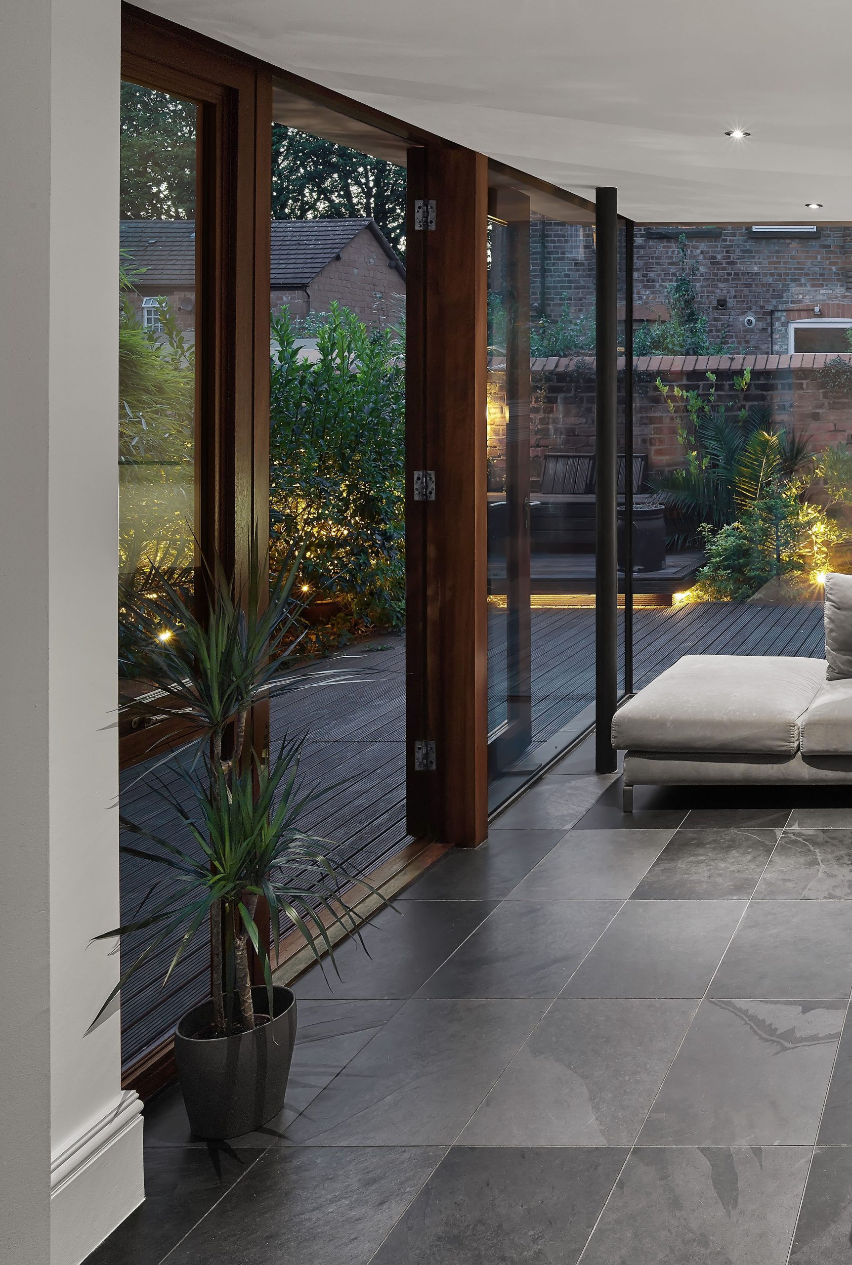 A landscaped courtyard garden flows from the floor to ceiling glazed garden room.