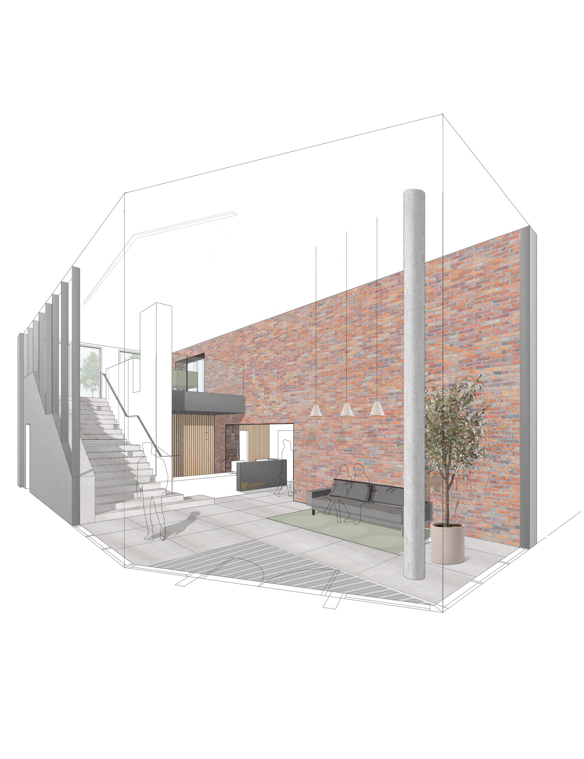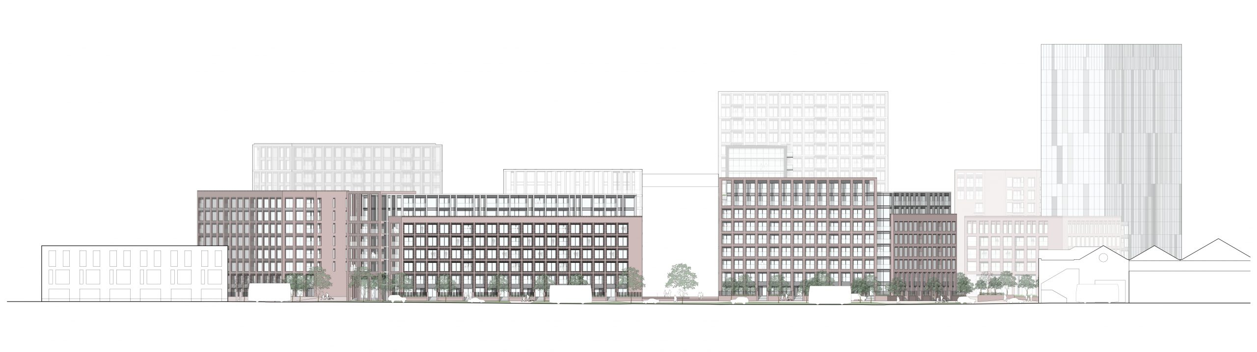 The scheme has been designed to reflect the massing and materiality of its surrounding predominantly listed context. A common brickwork grid ties the buildings together and sets a base rhythm from which slight variations occur, highlighting important corners, forms and nodes across the development. The five buildings are controlled and ordered by a rigorous approach to ensure that the overall development feels seamless and coherent. As the buildings increase in height, the style of architecture shifts to reflect the difference; the brickwork base is augmented with large scale cladding and a unitised glazed facade.