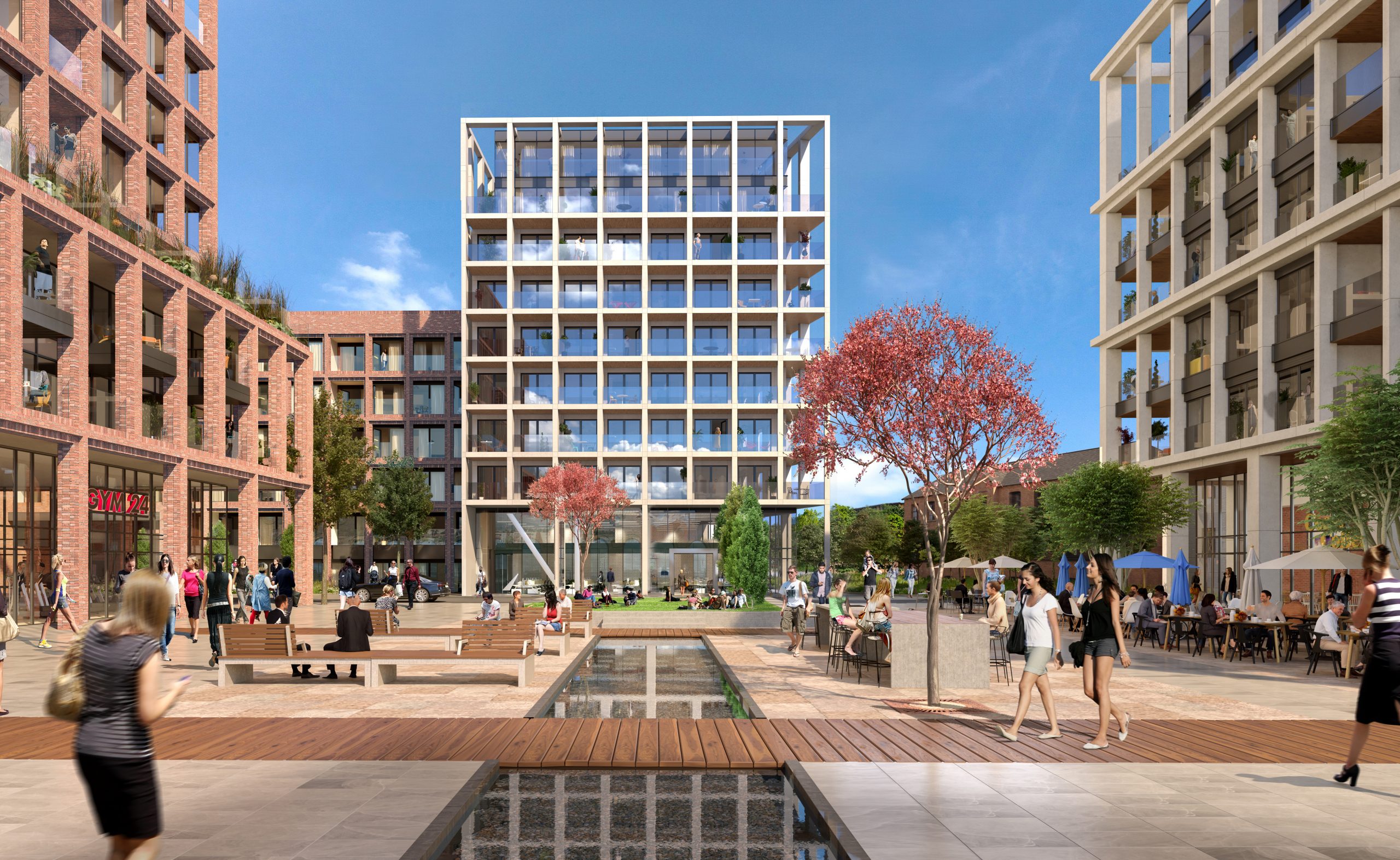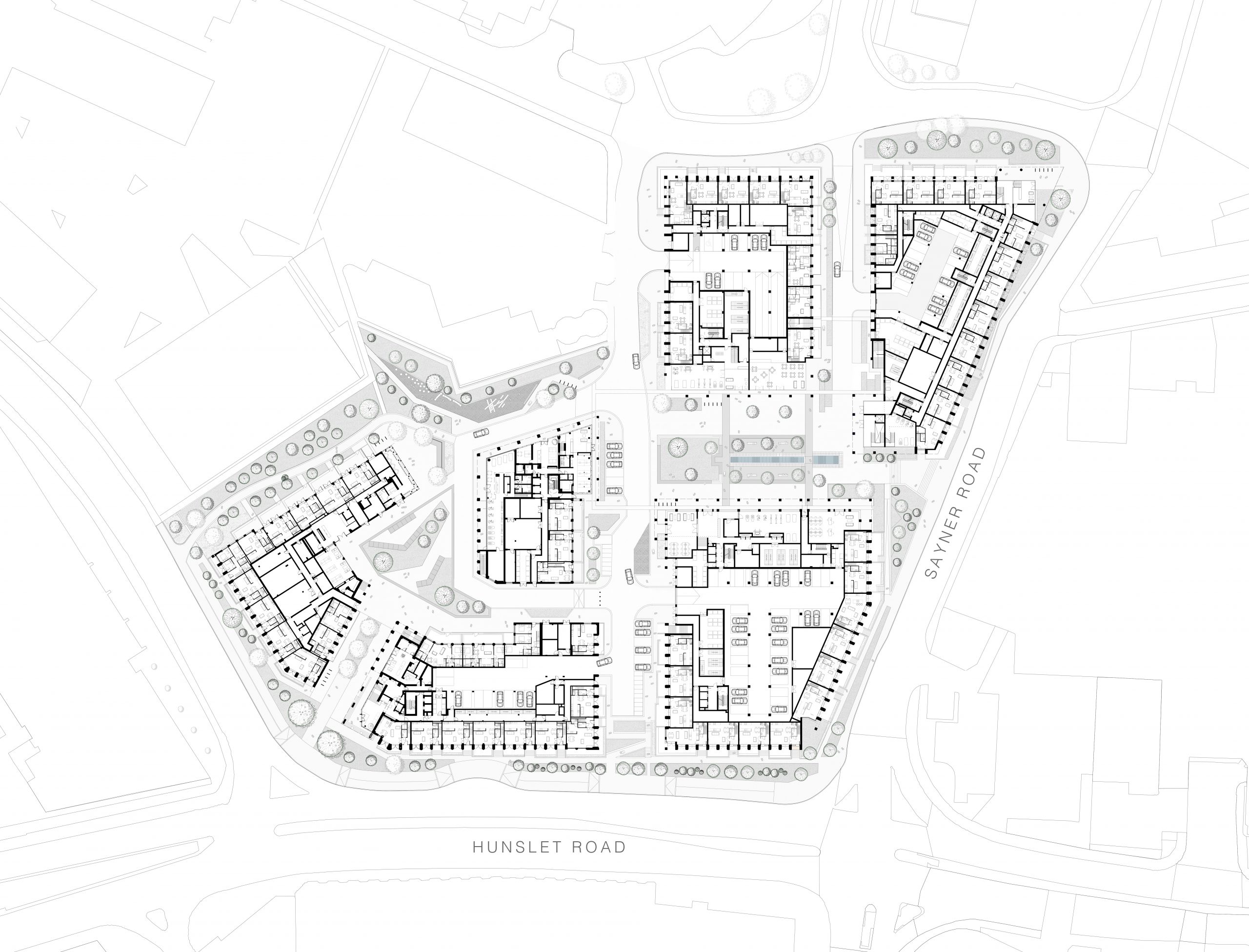 Arranged around an engaging, high quality public realm, the scheme includes five distinct buildings ranging from six to twenty storeys and linked by a raised publicly accessible podium. The landscaping forms a key component of the scheme and comprises a number of varied spaces ranging from the main plaza, to an informal square, a green garden route and semi private raised podiums. The external spaces have been designed to reflect the sense of community and are an extension of the living spaces. The public realm, located between the five buildings acts as a meeting place and provides calm, safe spaces overlooked by accomodation. Ground floor uses including a gym, offices, and cafe spaces offer natural surveillance and provide activity across the entire site.