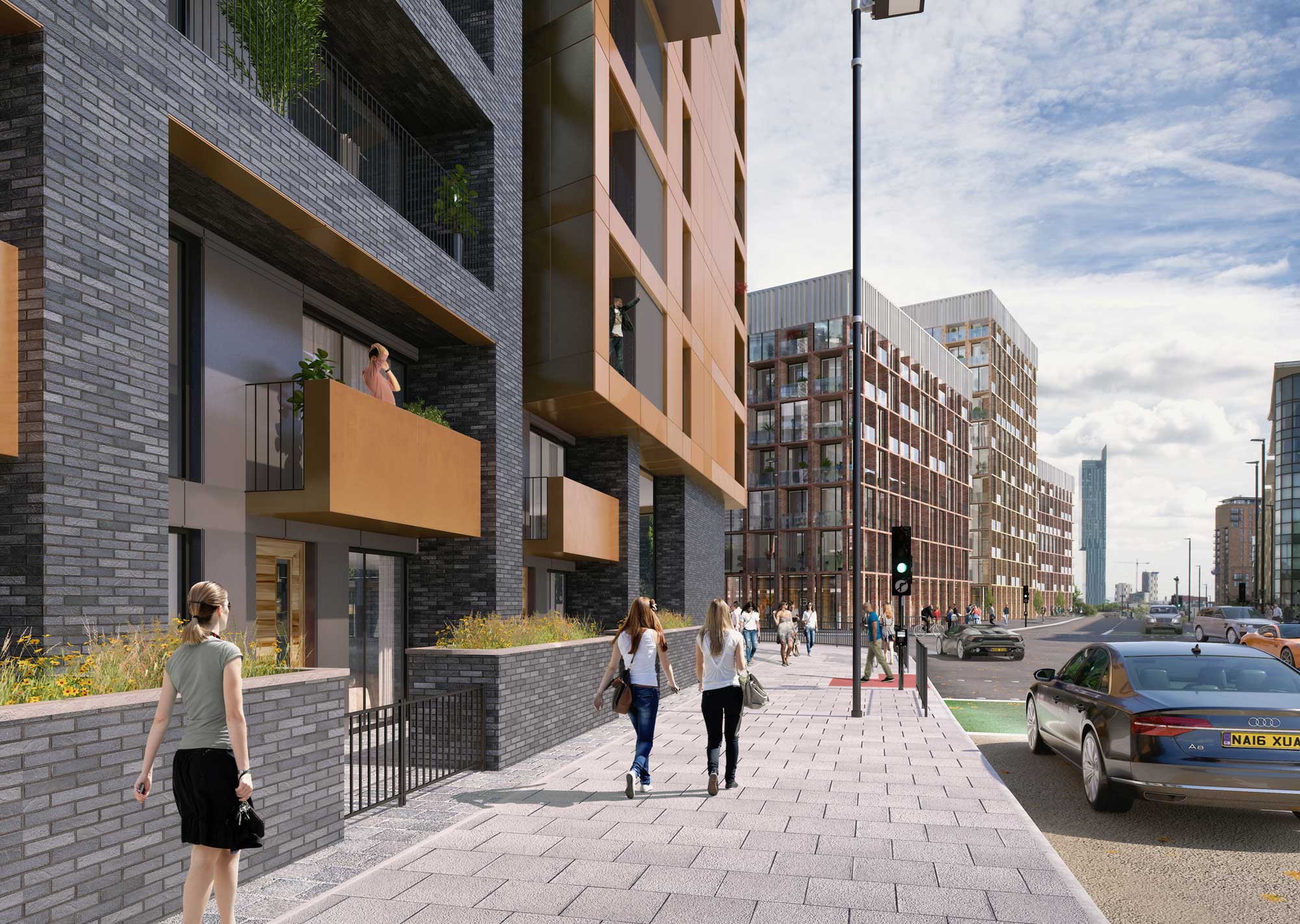 A double height entrance area, residents gym, lounge and communal landscaped courtyard provide high quality amenity for the residents. The highly visible double height entrance area links all the resident rooms and provides a physical and visual link between the street and the first floor landscaped courtyard. Large window openings and balconies providing views across Middlewood Locks to Manchester city centre ensure the scheme will be one of X1 Developments most desirable schemes.