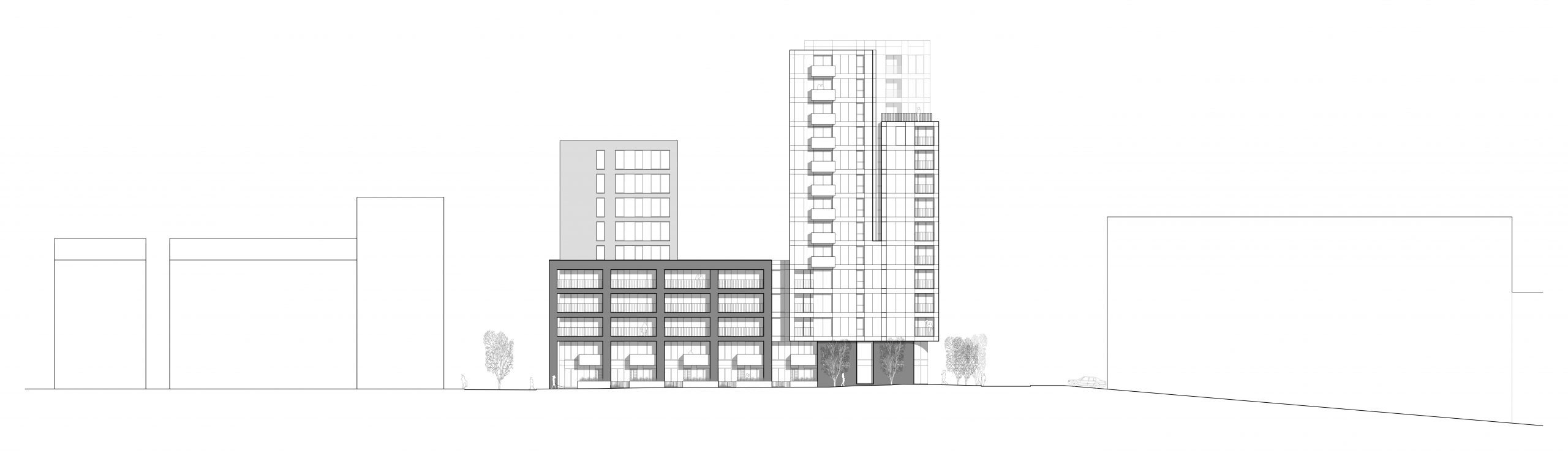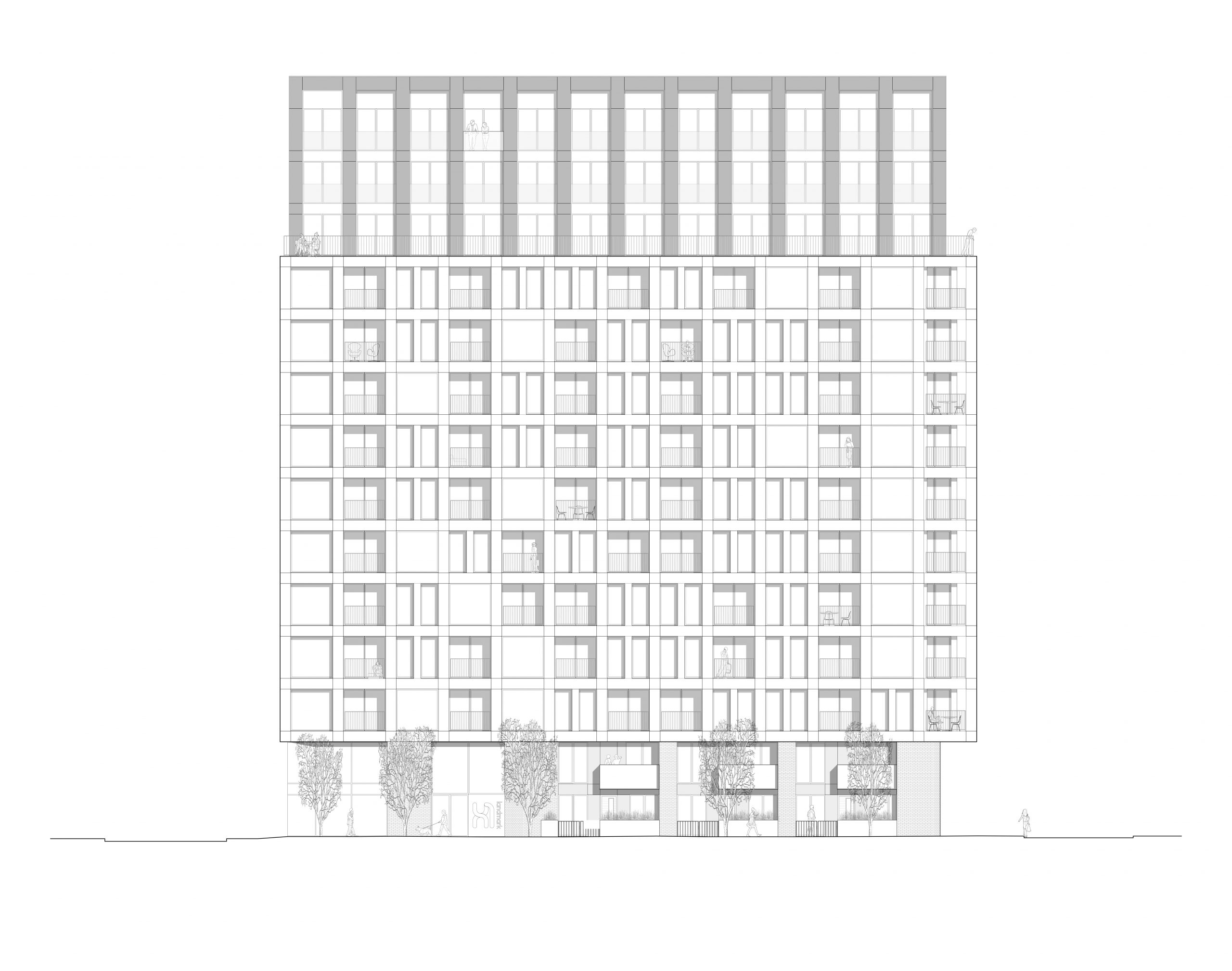 Conceived as two distinct forms within a single urban block, the scheme utilities a restrained palette of materials comprising metallic aluminium rainscreen cladding and black brickwork. Consistent opening sizes and repeated details such as metal railings and aluminium box balconies across the scheme create a unifying language ensuring that whilst distinctly different, the two blocks act as a single urban block.